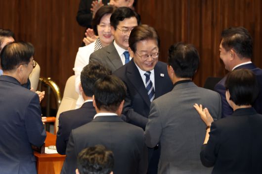 이재명 대통령이 26일 서울 여의도 국회 본회의장에서 정부의 2차 추가경정예산안 제출과 관련해 첫 시정연설을 하기 앞서 더불어민주당 의원들과 인사하고 있다. /연합 |