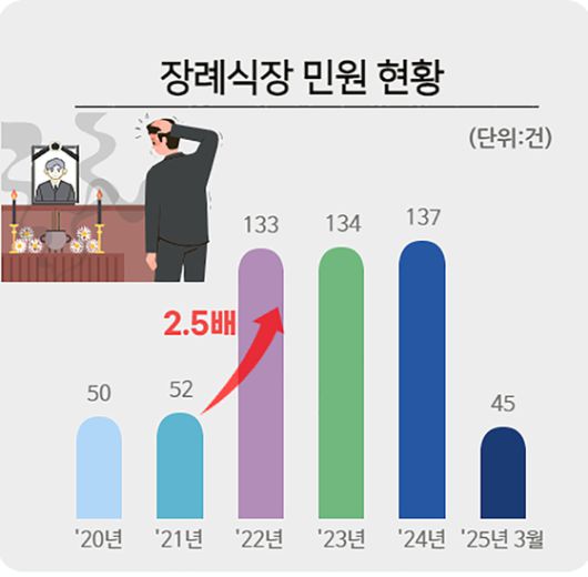 연도별로는 코로나19방역조치로 장례 수요가 줄었던 2020~2021년에는 매년 50여 건 수준이었으나, 2022년부터는 연 130건 안팎으로 2.5배 이상 증가한 것으로 나타났다.
