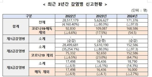 26일 질병관리청이 공개한 ‘2024 감염병 신고 현황 연보’를 보면 전수 감시 대상인 1~3급 법정감염병 신고 환자는 지난해 총 16만8586명으로 전년대비 54.5% 늘었다. 인구 10만명 당 329명이 법정감염병에 걸린 꼴이다. 다만 이는 2023년 8월 2급에서 4급으로 전환돼 전수 감시 대상에서 제외된 코로나19와 작년 1월부터 4급에서 3급으로 격상해 전수 감시가 시작된 매독은 제외한 수치다. 이들을 포함하면 2023년 562만6627명에서 작년 17만1376명으로 97% 줄었다.
