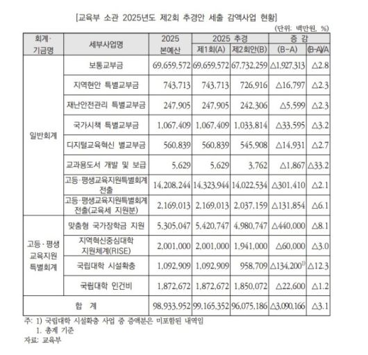 26일 국회예산정책처에 따르면 교육부 소관 세출사업 중 2025년 제2회 추경을 통해 감액 편성된 사업은 12개로 감액 규모는 총 3조901억6600만원이다.