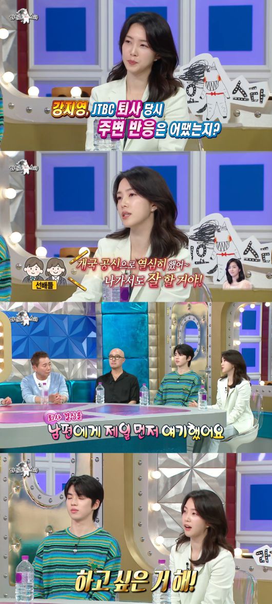 앞서 강지영은 JTBC 특채 1기 아나운서로 입사해 14년간 근무하다가 지난 4월 퇴사 소식을 알렸던 바. 김구라가 남편의 반응을 궁금해하자 강지영은 "결심하고 제일 먼저 얘기했다. 저한테 '하고 싶은 거 해' 그렇게 얘기해줬다"고 덧붙였다.