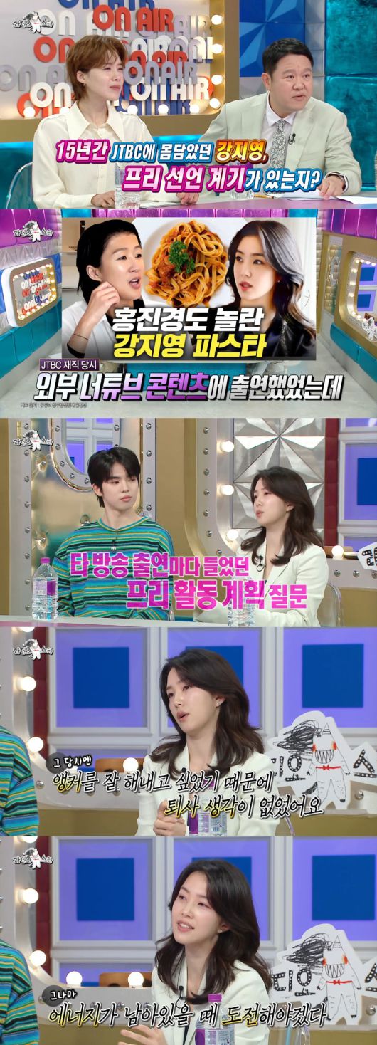 또 강지영은 프리 선언 계기로 "유튜브 채널에 나가면서 '이런 세계가 있구나'를 그때 좀 알았다. 많이 자유로워지고, 플랫폼이 다양해지니까 '이렇게도 활동을 해볼 수 있네'라고 생각했다"며 "그때도 계속 대외적인 활동을 하다보니 프리 질문을 하시더라"고 밝혔다.