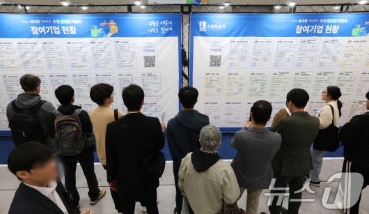 경기 수원시 영통구 수원컨벤션센터에서 열린 '2025 수원 일자리박람회'에서 구직자들이 참여기업 현황판을 살펴보고 있다. ⓒ News1 김영운 기자 |