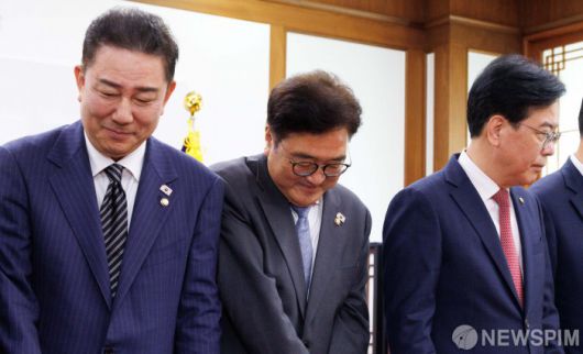 [서울=뉴스핌] 윤창빈 기자 = 김병기 더불어민주당 대표 직무대행 겸 원내대표(왼쪽부터), 우원식 국회의장, 송언석 국민의힘 원내대표가 24일 오전 서울 여의도 국회에서 우 의장 주재로 열린 양당 원내대표 회동에서 기념촬영을 하고 있다. 2025.06.24 pangbin@newspim.com |