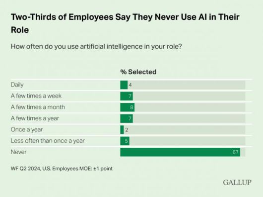 갤럽이 직원들에게 업무에서 AI를 얼마나 자주 사용하는지 조사한 결과, 직원의 67%가 AI를 전혀 사용하지 않는다고 답했다. 매일 AI를 사용한다고 답한 직원은 단 4%에 불과했으며, 주 몇 회 사용한다고 답한 직원은 7%였다. 월 몇 회 사용하는 직원이 8%, 연 몇 회 사용하는 직원이 7%로 나타났다. 이 수치는 2023년부터 2024년까지 본질적으로 변화가 없었으며, 이는 AI 도입이 사용량 증가를 위해 리더십과 교육이 필요함을 시사한다.