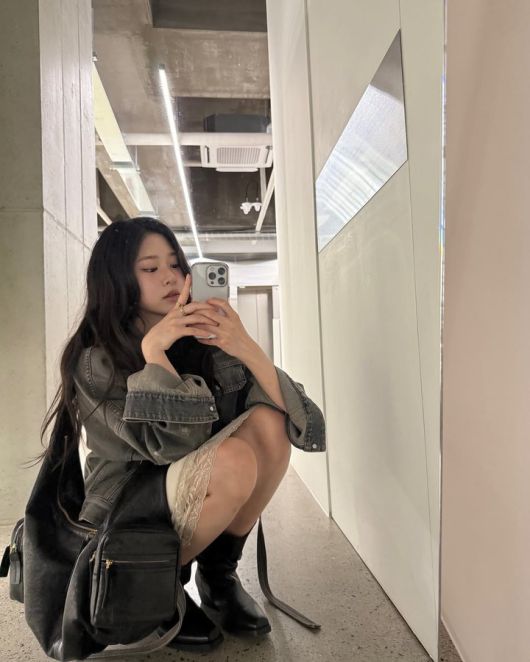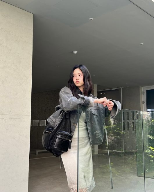 26일 김민주는 세련된 패션을 자랑하며, 그레이 색상의 데님 재킷과 블랙 백, 그리고 부츠를 매치한 스타일을 선보였다.