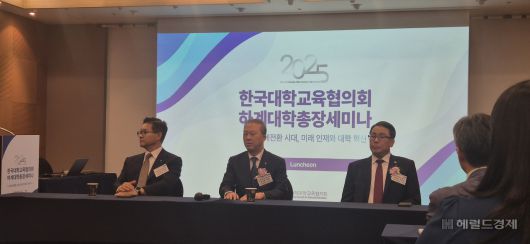 양오봉(가운데) 한국대학교육협의회(대교협) 회장과 이기정(왼쪽) 대교협 부회장, 변창훈 대교협 부회장이 26일 경주에서 열린 기자간담회에서 발언하고 있다. 김용재 기자 |