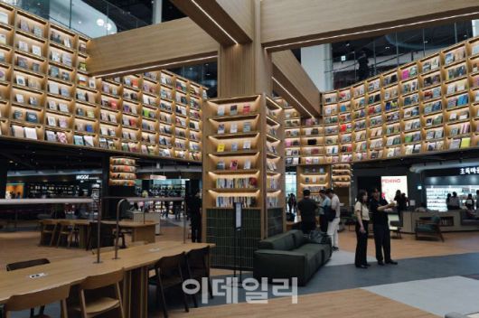 스타필드 마켓 킨텍스점은 입구에 들어서자마자 기존 이마트와의 차이점을 한눈에 볼 수 있다. 스타필드 ‘별마당 도서관’을 축소해놓은 듯한 ‘북 그라운드’가 광장처럼 넓게 자리하고 있어서다. 북 그라운드는 436㎡(약 132평) 규모다. 북 그라운드를 중심으로 입점 매장들이 배치돼 있는데 특히 ‘올리브영’, ‘다이소’, ‘스타벅스’ 같은 선호도 높은 매장은 기존대비 최대 3배가량 면적을 넓혔다. 때문에 전반적으로 킨텍스점 자체가 쾌적한 느낌을 줬다.