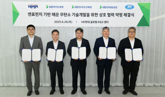 협약 체결식은 이날 경기 성남 HD현대 글로벌 R&D 센터에서 열렸으며 오승환 HD하이드로젠 상무와 정재준 HD현대중공업 전무, 박상민 HD한국조선해양 상무, 김민강 HMM 상무, 이영석 KR 부사장 등이 참석했다.