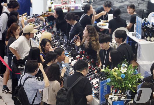 (서울=뉴스1) 오대일 기자 = 26일 서울 강남구 코엑스에서 막을 올린 '2025 서울국제주류&와인박람회'에서 방문객들이 다양한 주류를 시음하고 있다. 서울국제주류&와인박람회는 주류 산업의 최신 동향과 제품을 한자리에서 소개해 온 국내 최대 규모 주류박람회로 오는 28일까지 서울 강남 코엑스 C홀에서 열린다. 2025.6.26/뉴스1