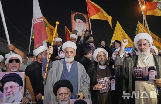 [바그다드=AP/뉴시스] 19일(현지 시간) 이라크 바그다드의 미 대사관이 있는 그린존으로 이어지는 다리 위에서, 이란 최고지도자 아야톨라 알리 하메네이의 초상화를 든 시아파 성직자들이 이스라엘의 이란 공습에 항의하는 시위를 벌이고 있다. 2025.06.26. |