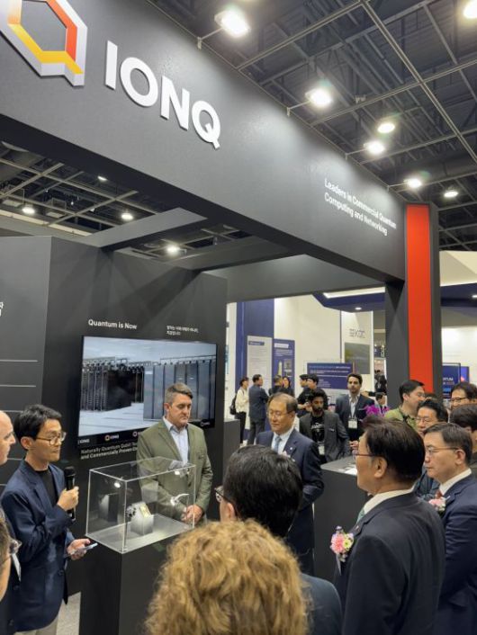 유상임 과기정통부 장관(우측 오른쪽 두번째)과 이식 KISTI 원장이 24일 서울 양재동 AT센터에서 열린 '퀀텀 코리아 2025' 행사장의 아이온큐 부스를 방문해 설명을 듣고 있다. 사진=백종민 테크 스페셜리스트 |