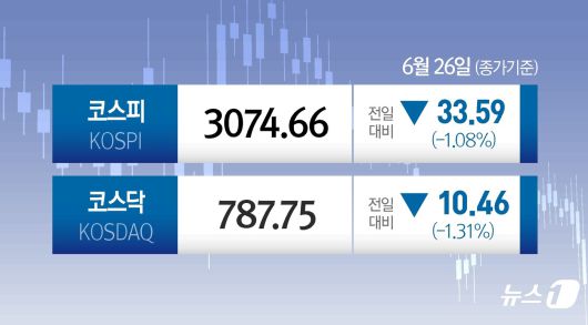 26일 한국거래소에 따르면 코스피는 전일 대비 28.69포인트(-0.92%) 하락한 3079.56으로 거래를 마쳤다.