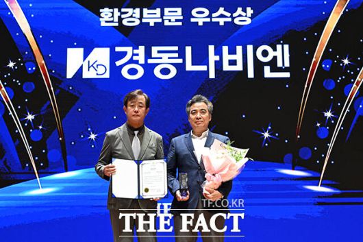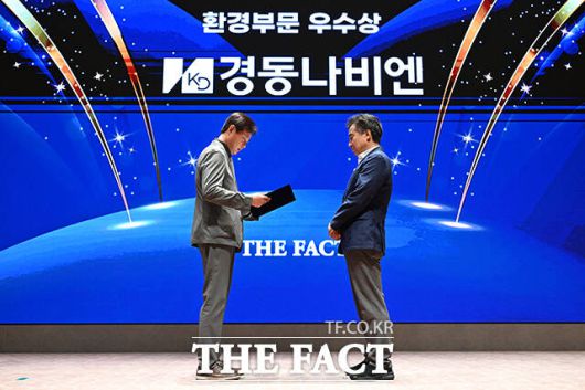 '2025 ESG 경영대상' 시상식이 26일 오후 서울 영등포구 여의도 한국거래소(KRX) 컨퍼런스홀에서 열린 가운데, 경동나비엔이 환경부문 우수상을 수상했다. 정재웅 더팩트 편집국장(왼쪽)이 경동나비엔 김용국 상무에게 상패를 수여한 뒤 기념 촬영을 하고 있다. /서예원 기자 |