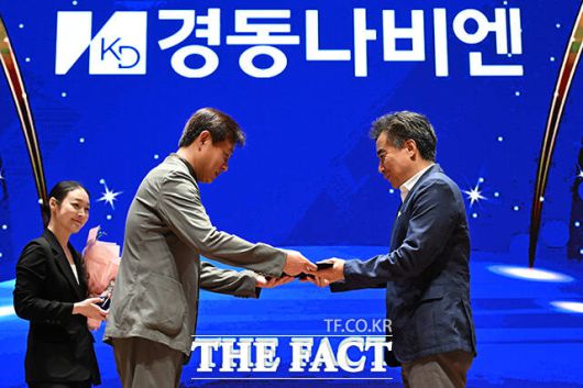 [더팩트ㅣ서예원 기자] '2025 ESG 경영대상' 시상식이 26일 오후 서울 영등포구 여의도 한국거래소(KRX) 컨퍼런스홀에서 열린 가운데, 경동나비엔이 환경부문 우수상을 수상했다. 정재웅 더팩트 편집국장(왼쪽)이 경동나비엔 김용국 상무에게 상패를 수여한 뒤 기념 촬영을 하고 있다.