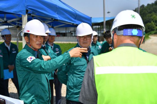 최학범 경남도의회 의장(왼쪽)이 26일 본격적인 장마철을 앞두고 함안군 광정지구 하천재해 예방사업 현장을 방문해 공사 진행 상황을 점검하고, 여름철 태풍‧호우 등 자연재해 대비 상황을 확인하고 있다. [사진=경남도의회] 2025.06.26 |