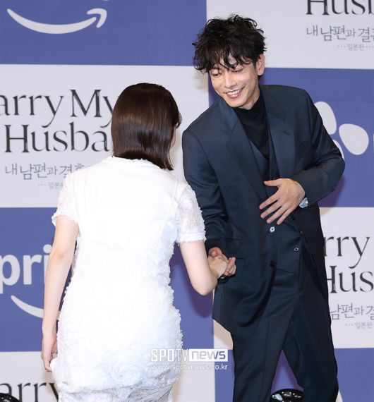 [스포티비뉴스=서울, 곽혜미 기자] 일본판 '내 남편과 결혼해줘' 제작발표회가 26일 오후 서울 구로구 신도림 라마다 호텔에서 열렸다. 배우 사토 타케루가 코시바 후우카를 에스코트하고 있다. <저작권자 ⓒ SPOTV NEWS. 무단전재 및 재배포 금지>
