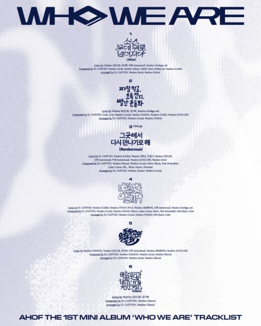 아홉(스티븐, 서정우, 차웅기, 장슈아이보, 박한, 제이엘, 박주원, 즈언, 다이스케)은 26일 자정 공식 SNS 채널을 통해 데뷔앨범 '후 위 아(WHO WE ARE)' 트랙리스트 이미지를 공개했다. 이에 따르면, 아홉의 데뷔곡은 '그곳에서 다시 만나기로 해 (Rendezvous)'다. 이외에도 앞서 선공개된 인트로 트랙 '소년, 무대 위로 넘어지다 (Intro)'를 비롯해 '파랑 학교, 초록 잔디, 빨간 운동화', '미완성은 아닐거야', '우주 최고의 꼴찌', '아홉, 우리가 빛나는 숫자 (Outro)'가 수록돼 총 6개 신곡을 만나볼 수 있다.