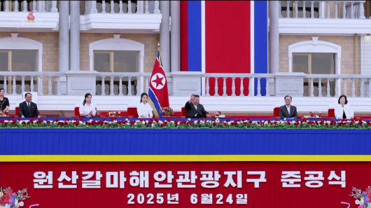 김정은 국무위원장이 지난 24일 원산갈마해안관광지구 준공식에서 딸 주애, 아내 리설주 여사와 함께 주석단에 앉아 있다. 연합뉴스 |