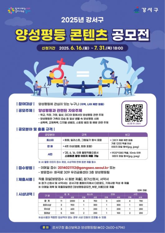 서울 강서구가 일상 속에서 성평등 문화를 확산시키기 위해 ‘2025 양성평등 콘텐츠 공모전’을 개최한다고 26일 밝혔다.