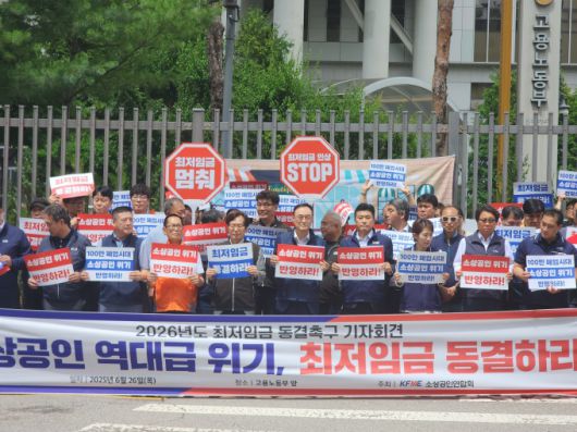 송치영 소상공인연합회 회장은 고용부 정문 앞에서 열린 최저임금 동결 촉구 기자회견을 열고 "전국 소상공인을 대표해 최저임금위원회에 내년 최저임금 동결을 강력 촉구한다"며 "일시적으로라도 동결해 소상공인 회복 시간과 반전의 모멘텀을 제공해야 한다"고 말했다.