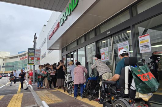 26일 오전 9시 20분 경기도 구리시 롯데마트 그랑그로서리 구리점. 영업 시작 40분 전부터 마트 입구에는 약 1000명이 길게 줄을 섰다. 4년 만에 롯데마트가 다시 문을 연다는 소식을 듣고 몰려든 인파다.