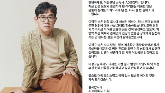 소속사 측은 또 "사고 당일, 평소 복용 중인 공황장애약과 감기약을 복용한 뒤 병원 진료를 위해 이동하던 중 발생한 일이었지만, 보다 신중했어야 했다는 점을 인정하고 있다"며 "이경규 역시 이번 일을 계기로 약 복용 후 운전에 더욱 신중을 기할 것이며, 같은 일이 반복되지 않도록 깊이 반성하고 있다. 앞으로도 더욱 조심스럽고 책임 있는 모습을 보여드릴 것을 약속드린다"고 덧붙였다.