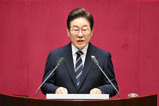 이재명 대통령이 26일 오전 서울 여의도 국회에서 열린 제426회국회(임시회) 제2차 본회의에서 2025년도 제2회 추가경정예산안에 대한 정부의 시정연설을 하고 있다. 국회사진기자단 |