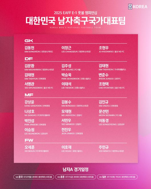 대한축구협회는 26일 동아시아축구연맹(EAFF)의 결정으로 EAFF에서 주관하는 E-1 챔피언십 대회(동아시안컵) 엔트리가 23명에서 26명으로 확대됨에 따라 남녀 대표팀 모두 기존 명단에 3명을 추가 발탁한다고 발표했다.