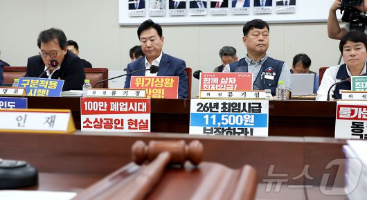 26일 세종시 정부세종청사에서 고용노동부에서 열린 최저임금위원회 제7차 전원회의에 참석한 류기정 사용자위원과 류기섭 근로자위원이 회의 시작에 앞서 위원들의 발언을 듣고 있다 2025.6.26/뉴스1 ⓒ News1 김기남 기자 |