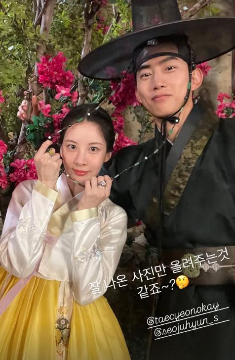 공개된 사진 속 두 사람은 화사한 한복을 입고 다정한 포즈를 취하고 있다. 아름다운 꽃나무를 배경으로 서현은 단아한 미모를 뽐냈고, 갓을 쓴 옥택연은 늠름한 자태를 자랑했다.