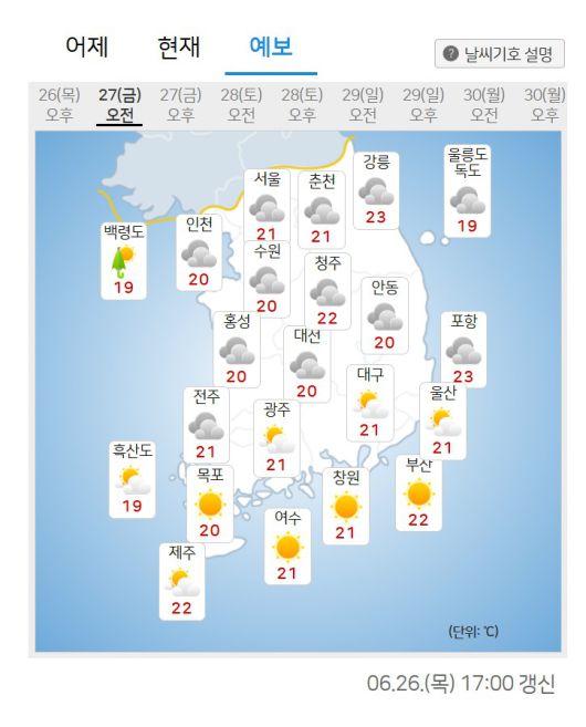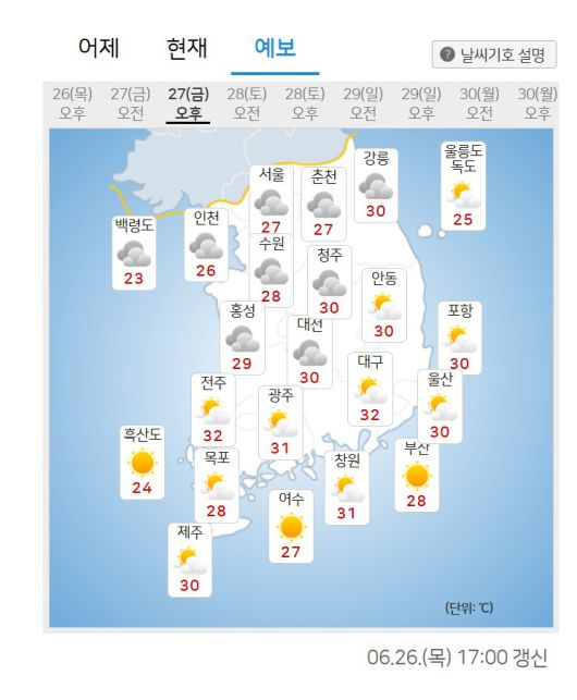 27일 아침 최저기온은 서울 21도, 인천 20도, 수원 20도, 춘천 21도, 강릉 23도, 청주 22도, 대전 20도, 전주 21도, 광주 21도, 대구 21도, 부산 22도, 제주 22도 등으로 예보됐다.