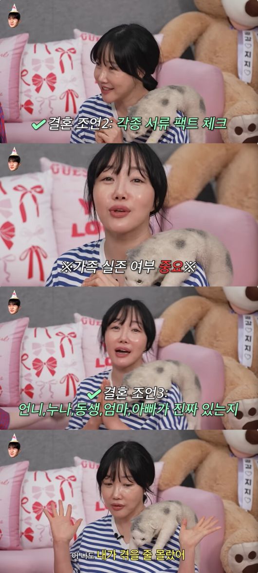 이어 낸시랭은 "서류 다 떼봐야 한다. 빚이 얼마인지 얘기는 하겠지만 사실인지 확인하고"라며 "가족들 실제로 있는지 확인해야 한다. 엄마 아빠 언니 누나가 진짜 맞는지"라고 마라맛 현실 조언을 남겨 폭소를 자아냈다. 낸시랭은 "이렇게 세가지 확인하고 결혼하면 좋겠다. 힘든 걸 겪었던 왕언니 왕누나로서 하는 말"이라면서 "나도 내가 겪을 줄 몰랐다"고 털어놨다.