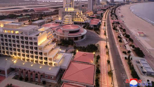 북한 조선중앙통신은 오늘 원산갈마해안관광지구에 대해 "명승지를 찾는 국내외의 내빈들이 기호에 맞게 선택할 수 있는 2만 명 숙박 능력의 호텔과 여관들이 자리 잡고 있는 관광지구"라고 설명해, 외국 관광객 유치를 염두에 둔 시설임을 시사했습니다.