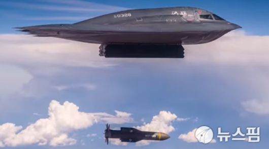 미 공군 B-2 스텔스 폭격기가 무게 약 13t에 달하는 벙커버스터(GBU-57)을 투하하는 장면. [사진=미 공군] 2025.06.23 gomsi@newspim.com |