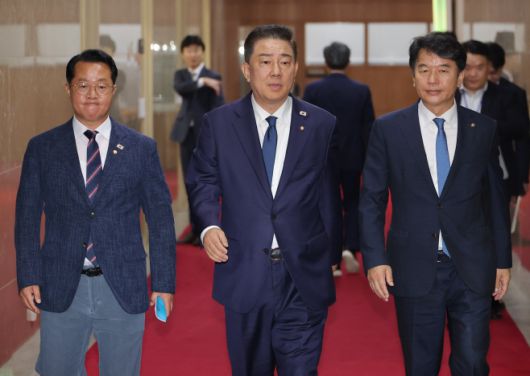 더불어민주당 김병기 원내대표(가운데), 문진석 원내수석부대표(오른쪽), 문금주 원내대변인이 26일 우원식 국회의장과 회동을 마친 뒤 의장실을 나서고 있다. /연합 |