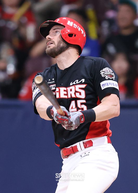 [스포티비뉴스=고척, 곽혜미 기자] 2025 신한 SOL Bank KBO리그 키움 히어로즈와 KIA 타이거즈의 경기가 26일 오후 서울 구로구 고척스카이돔에서 열렸다. 2회초 선두타자로 나선 KIA 위즈덤이 중견수 플라이를 날리고 있다. <저작권자 ⓒ SPOTV NEWS. 무단전재 및 재배포 금지>