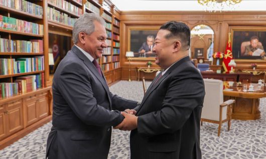 지난 4일 평양에서 만난 김정은 북한 국무위원장(오른쪽)과 세르게이 쇼이구 러시아 국가안보회의 서기. 조선중앙통신, 연합뉴스 |