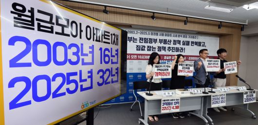 경제정의실천시민연합(경실련)이 25일 개최한 2003.2~2025.5 정권별 서울 아파트 시세 분석 결과 발표 기자회견에서 참석자들이 구호를 외치고 있다. 연합뉴스 |