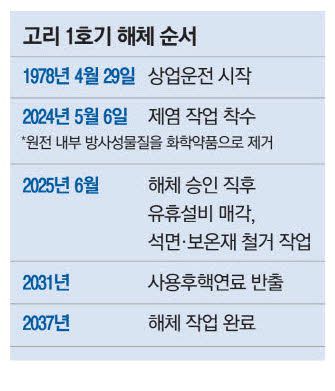 한수원은 해체 승인을 받으면 다음달부터 터빈 건물 내 설비부터 순차적으로 해체할 예정이다. 유휴설비에 대한 매각과 석면·보온재 철거 공사를 먼저 진행한다. 비관리구역 내부와 옥외 설비 해체 공사를 시행한다. 이후 고리본부 사용후핵연료 건식저장시설이 구축되면 발전소 내 습식저장소에 보관 중인 사용후핵연료를 반출한다.