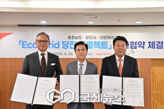 김태흠 지사는 26일 도청 상황실에서 오치훈 대한제강 회장, 오성환 당진시장과 '에코-그리드(Eco-Grid) 당진 프로젝트' 추진을 위한 투자양해각서를 체결했다.