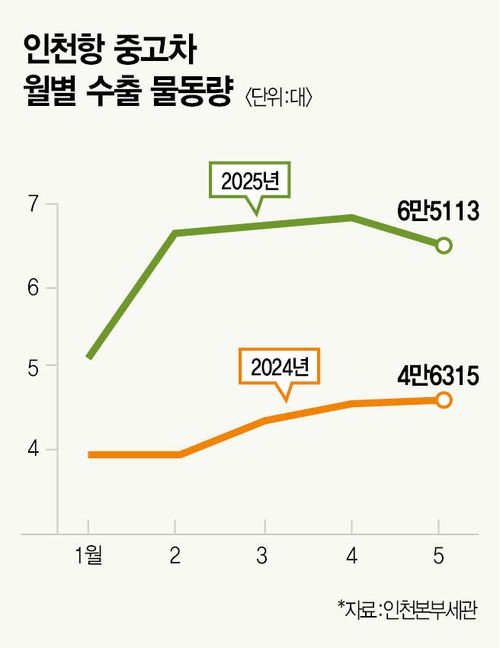 최근 더 가팔라지는 중고차 수출 증가세는 국내 1위 중고차 수출 항만인 인천항 통계에서도 나타난다. 인천본부세관에 따르면 올해 1~5월 인천항 중고차 물동량은 전년 같은 기간 대비 48.8% 늘었다. 올 들어 매달 6만대가량을 해외로 내보내면서 세관 신고 기준 총 31만8997대 수출 실적을 기록했다. 전년 대비 10만대 이상 늘어난 수치다. 지난해 50만대 수출을 훌쩍 넘어 올해는 70만대 이상 수출 달성이 전망된다.