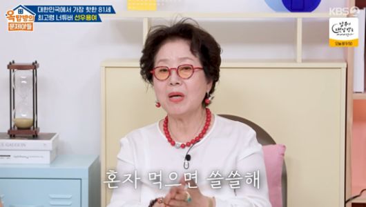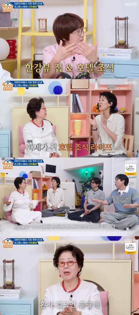 선우용여의 유튜브 얘기가 나왔다. 선우용여는 "나도 깜짝 놀랐다. 있는 대로 내가 생활하는 걸 보여주고 싶을 따름이었는데, 이렇게 좋아해 주실 줄 몰랐다"라며 인기에 감사함을 표했다.