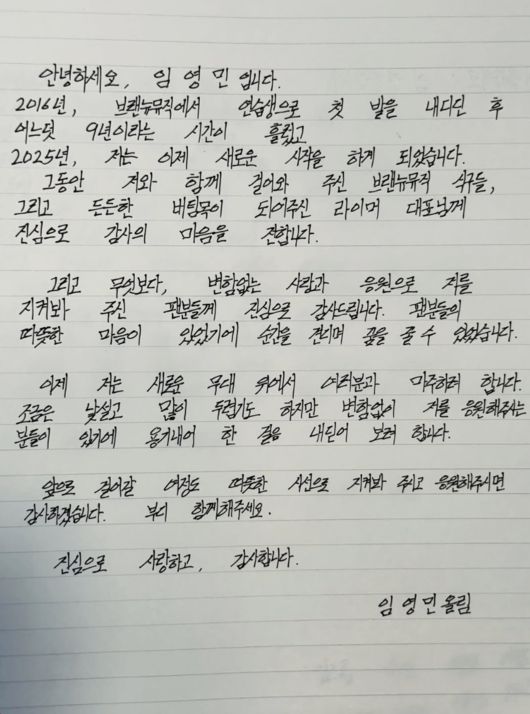 26일 임영민은 개인 계정을 통해 손편지를 올리며 팬들에 전속계약 종료 소식을 전했다.