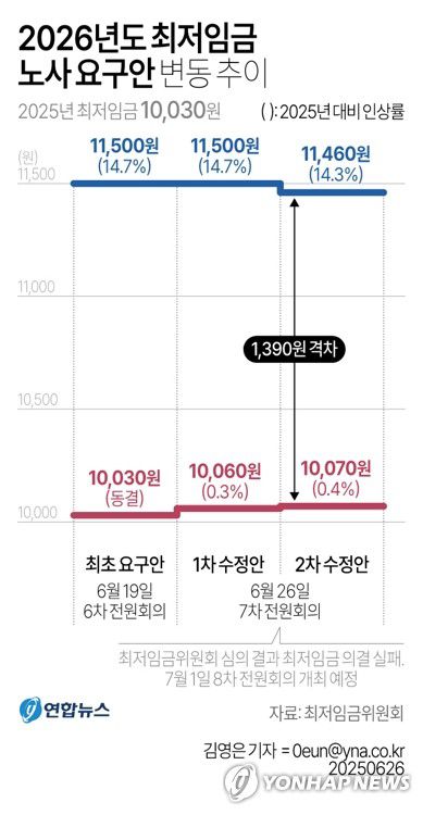 경영계는 올해와 같은 '1만30원 동결' 요구에서 1만60원으로 30원을 올려 1차 수정안을 냈다. 2차 수정안에서는 10원을 더 올려 1만70원(올해 대비 0.4% 인상)을 제시했다.