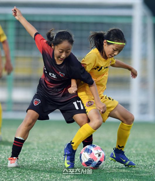 전남 광양중앙초 임시현(오른쪽)이 26일 경남 합천에서 열린 ‘2025 스포츠케이션 명품도시 합천에서 펼쳐지는 제33회 여왕기 전국여자축구대회’ 초등부 경북 상대초와 결승에서 상대초 김라온과 볼을 다투고 있다. 2025. 6. 26.