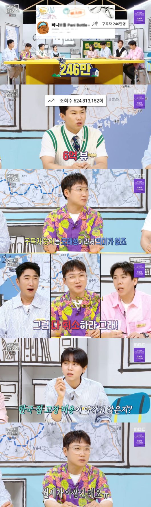 빠니보틀은 "제가 6년 차하고 있는데, 굳이 구독자 순으로 따지면 (1위가) 맞다"고 설명했다. 양세형은 "구독자가 246만 명이고 누적 조회수가 6억 뷰다. 제가 다 조사를 했다"고 말했다.