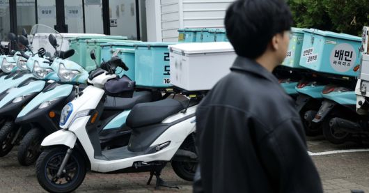 울 강남구 우아한청년들 자회사 ‘딜리버리N’에 배달용 오토바이들이 줄줄이 주차되어 있다. [김호영 기자] |