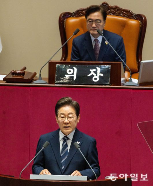 이재명 대통령이 26일 국회 본회의장에서 취임 후 처음으로 추가경정예산(추경)안에 대한 정부의 시정연설을 하고 있다. 이 대통령은 “경제 위기에 정부가 손을 놓고 긴축만을 고집하는 건 무책임한 방관이자 정부의 존재 이유를 스스로 부정하는 일”이라며 국회의 신속한 추경안 심사를 촉구했다. 박형기 기자 oneshot@donga.com |