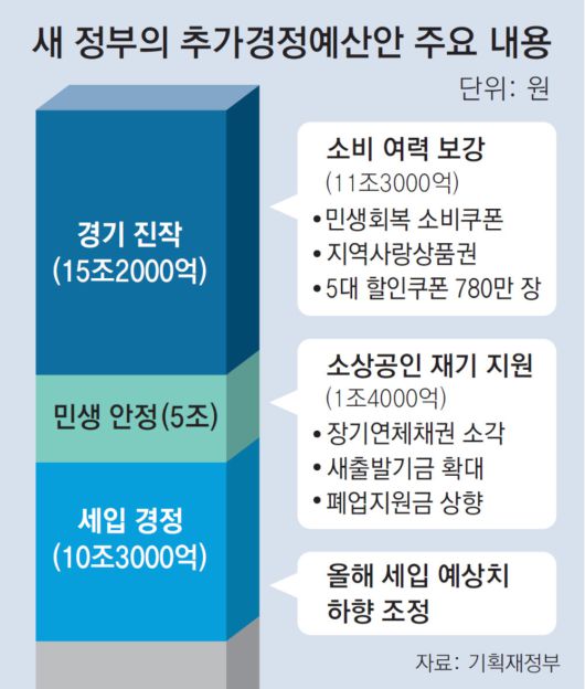 이 대통령은 이날 연설에서 추경안 세부 내용을 상세히 설명했다. 이 대통령은 “심각한 내수 침체에 대응하기 위해 소비 진작 예산 11조3000억 원을 담았다”며 “민생회복 소비쿠폰을 편성해 소비 여력을 보강하고 내수 시장 활성화를 지원하고자 한다”고 말했다. 민간 소비가 올 1분기(1∼3월)에도 0.1% 줄어들면서 좀처럼 회복될 기미가 보이지 않자 재정이 마중물 역할을 하도록 하겠다는 것이다. 이번 추경안에는 전 국민에게 최소 15만 원을 지급하는 민생회복 소비쿠폰 등을 위한 예산이 담겨 있다.